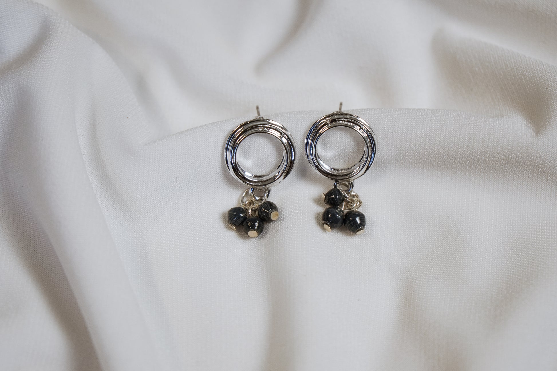 Artful design meets delicate detail. These earrings feature an intricate circular pattern, finished with a small cluster of hand-rolled beads at the base. Thoughtfully crafted, they bring a subtle touch of sustainable elegance to any outfit.