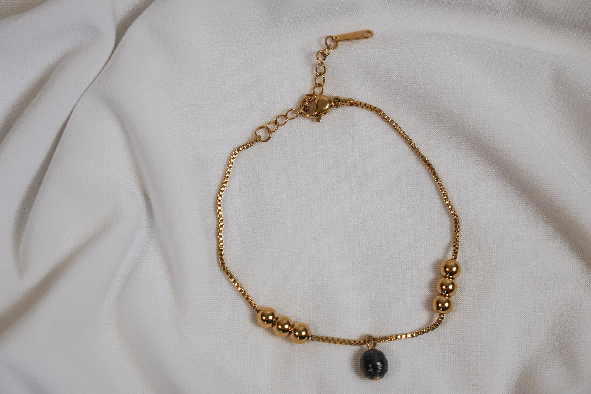 Elevate simplicity with thoughtful detail. A single hand-rolled paper bead, carefully framed by gleaming metal accents, rests gracefully on a delicate single-strand bracelet. Lightweight and refined, this piece merges subtle sophistication with sustainable artistry—perfect for layering or wearing alone as an everyday statement.