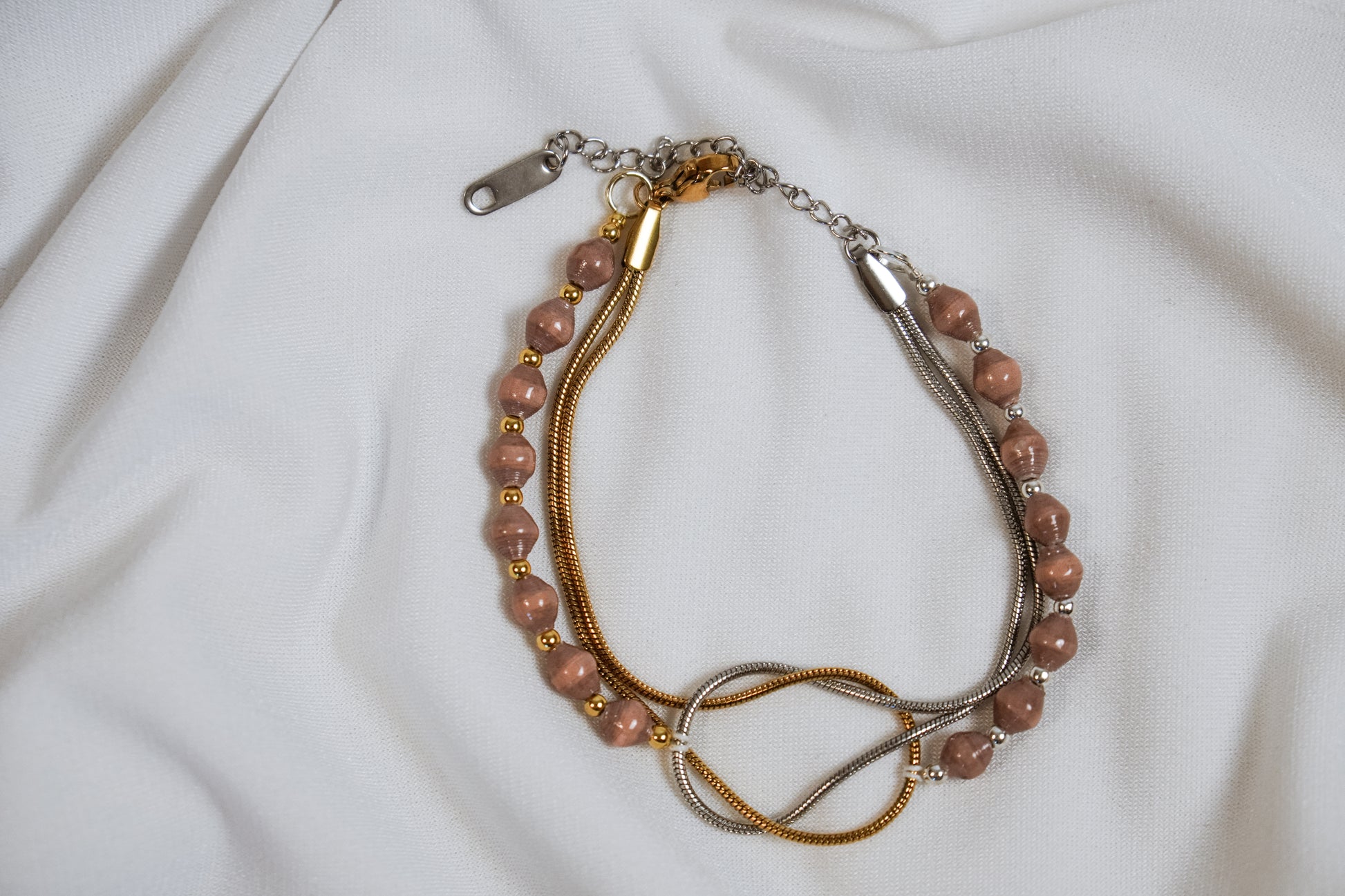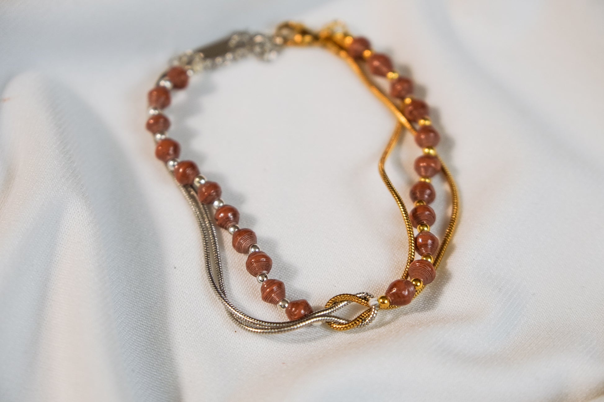 Celebrate layered elegance with a playful mix of metals. Hand-rolled paper beads run the length of this bracelet, flanked by intertwined silver and gold chains, all meeting in a central adjustable knot for a perfect fit. Lightweight and versatile, this piece blends sustainable craftsmanship with everyday sophistication, making it an effortless statement for any look.