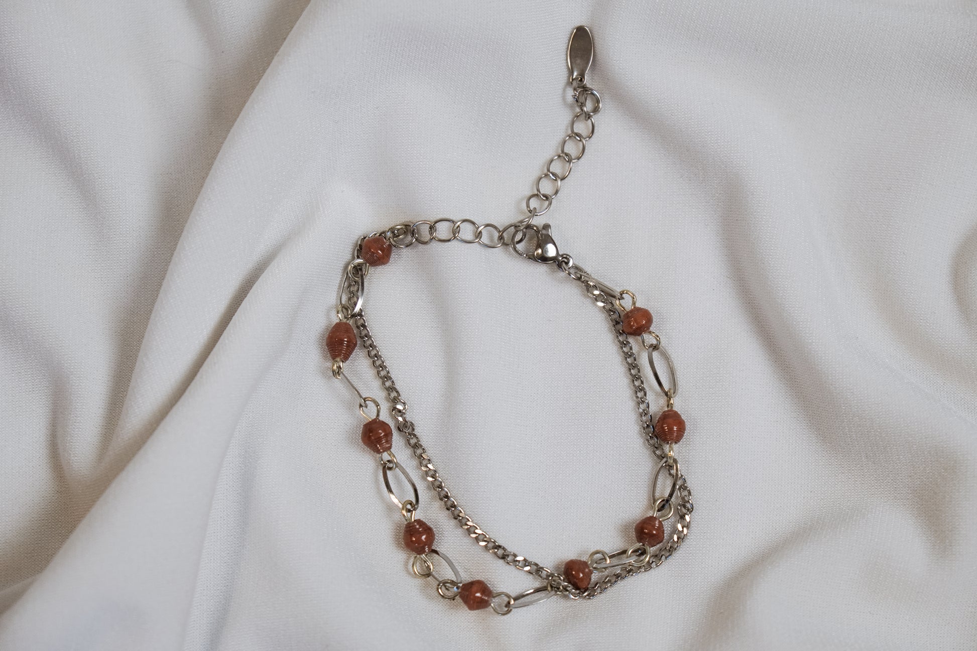 Textured elegance in perfect balance. This two-stranded bracelet pairs a delicate dainty chain with a linked strand, where hand-rolled beads are thoughtfully anchored between each link. Lightweight and versatile, it’s a refined piece of sustainable craftsmanship designed to wear alone or layered for everyday sophistication.