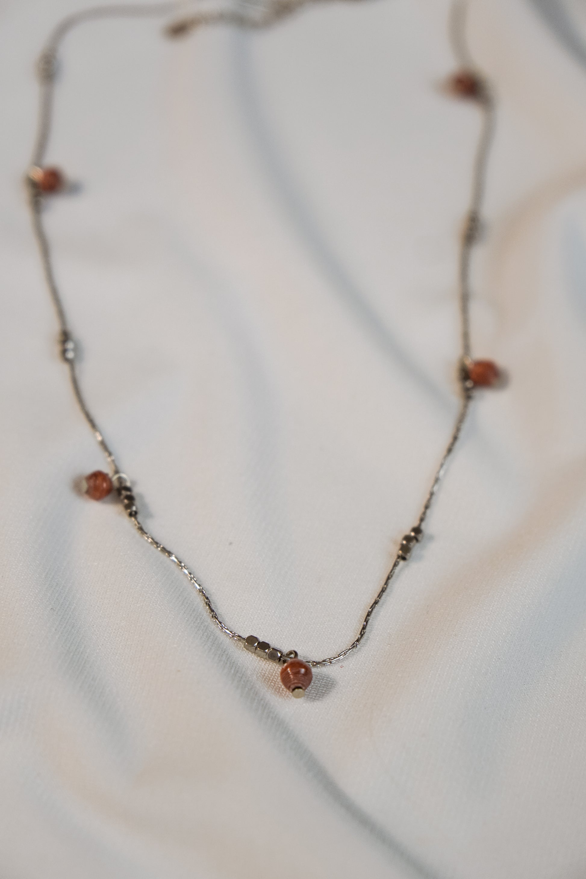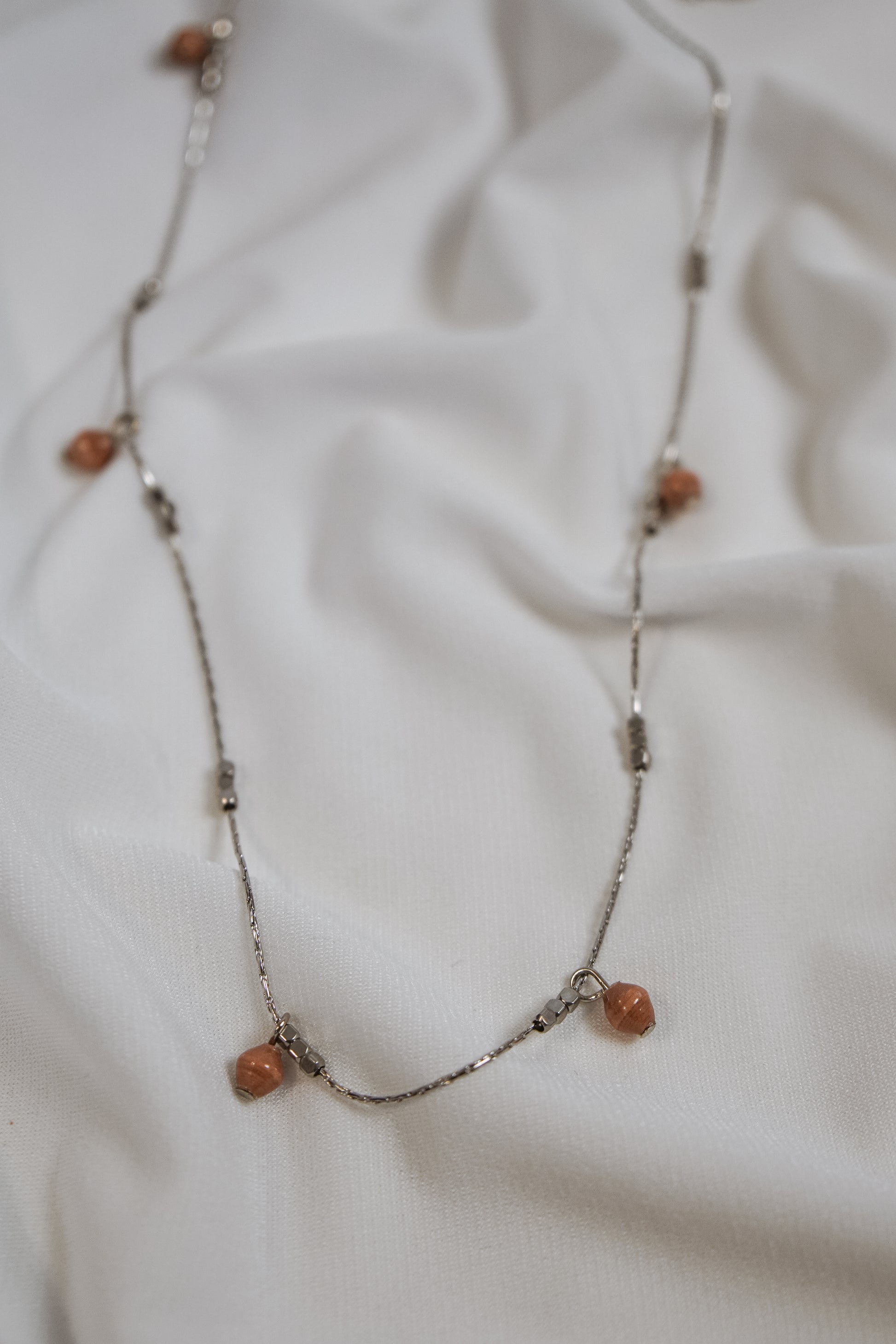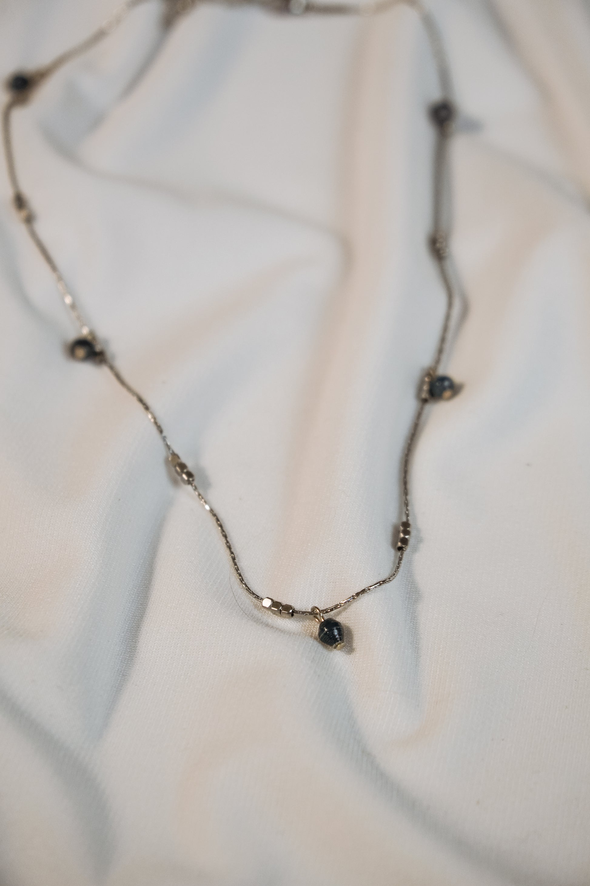 Subtle, airy, and artfully spaced, this necklace brings delicate detail to any look. Hand-rolled paper beads are anchored along a dainty chain, creating a light rhythm of color and texture. Effortless and thoughtfully crafted, it’s the kind of everyday piece that feels both minimal and meaningful.