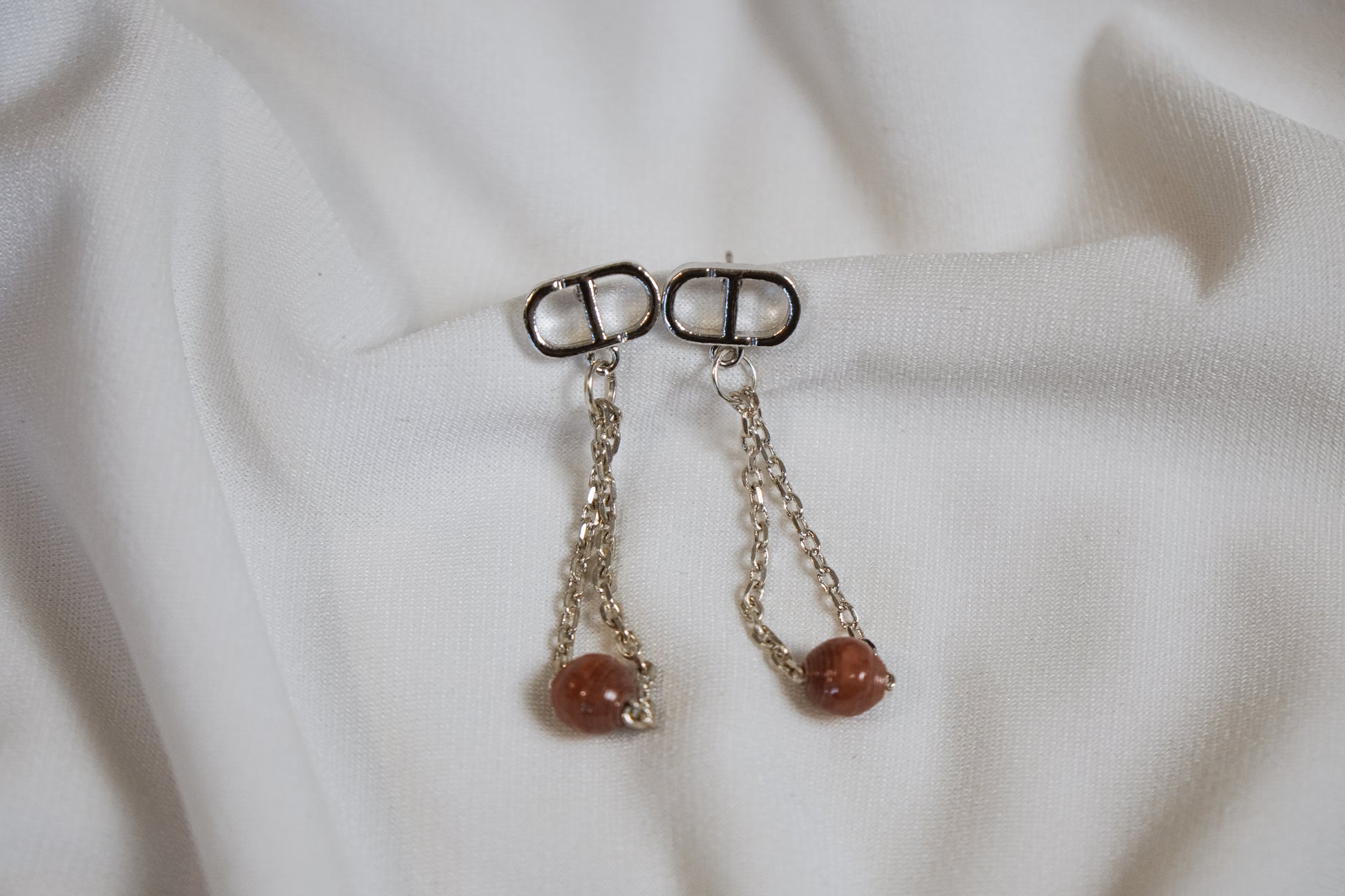 Delicate movement meets intricate design. These earrings feature a patterned stud from which a slender chain dangles, finished with a single hand-rolled bead at the tip. Thoughtfully crafted, they offer a subtle yet elegant touch of sustainable artistry.