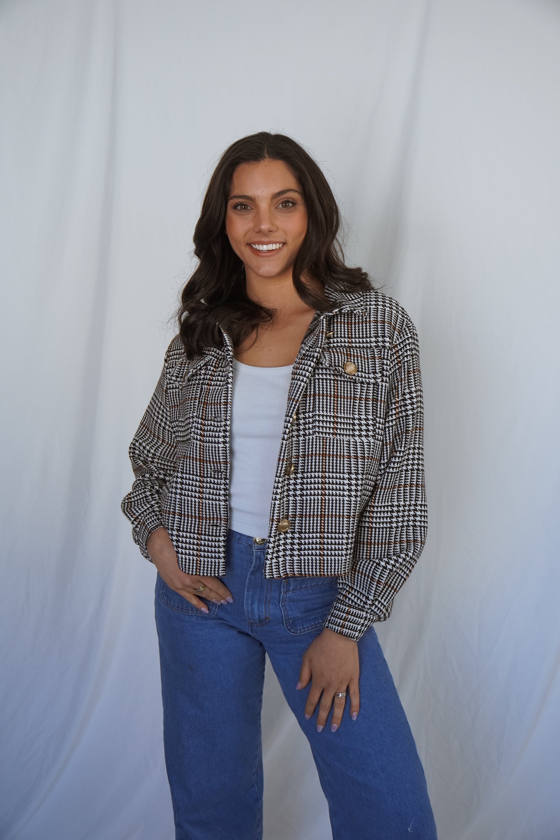 The perfect throw-on layer. Cropped just above the waist with a relaxed, boxy fit, this jacket instantly elevates any look. Available in houndstooth or glen check pattern with subtle metal accents. Gold and silver toned buttons, flap pockets, and rolled sleeves add effortless polish.